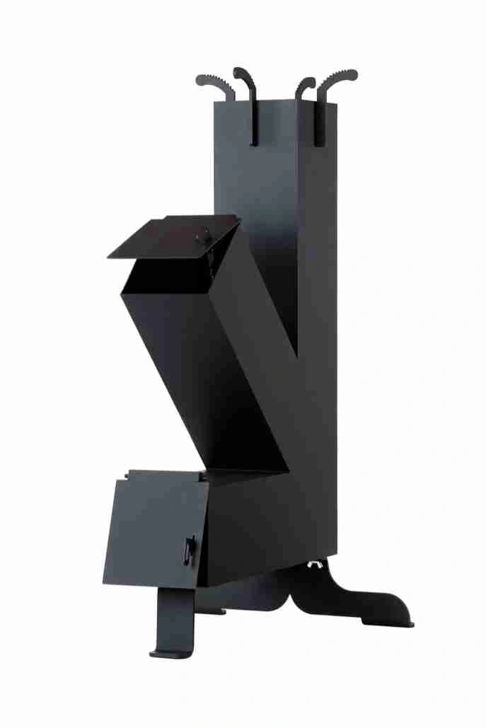 Soba pe lemne tip racheta realizata din tabla de otel vopsita cu email rezistent la temperaturi inalte.